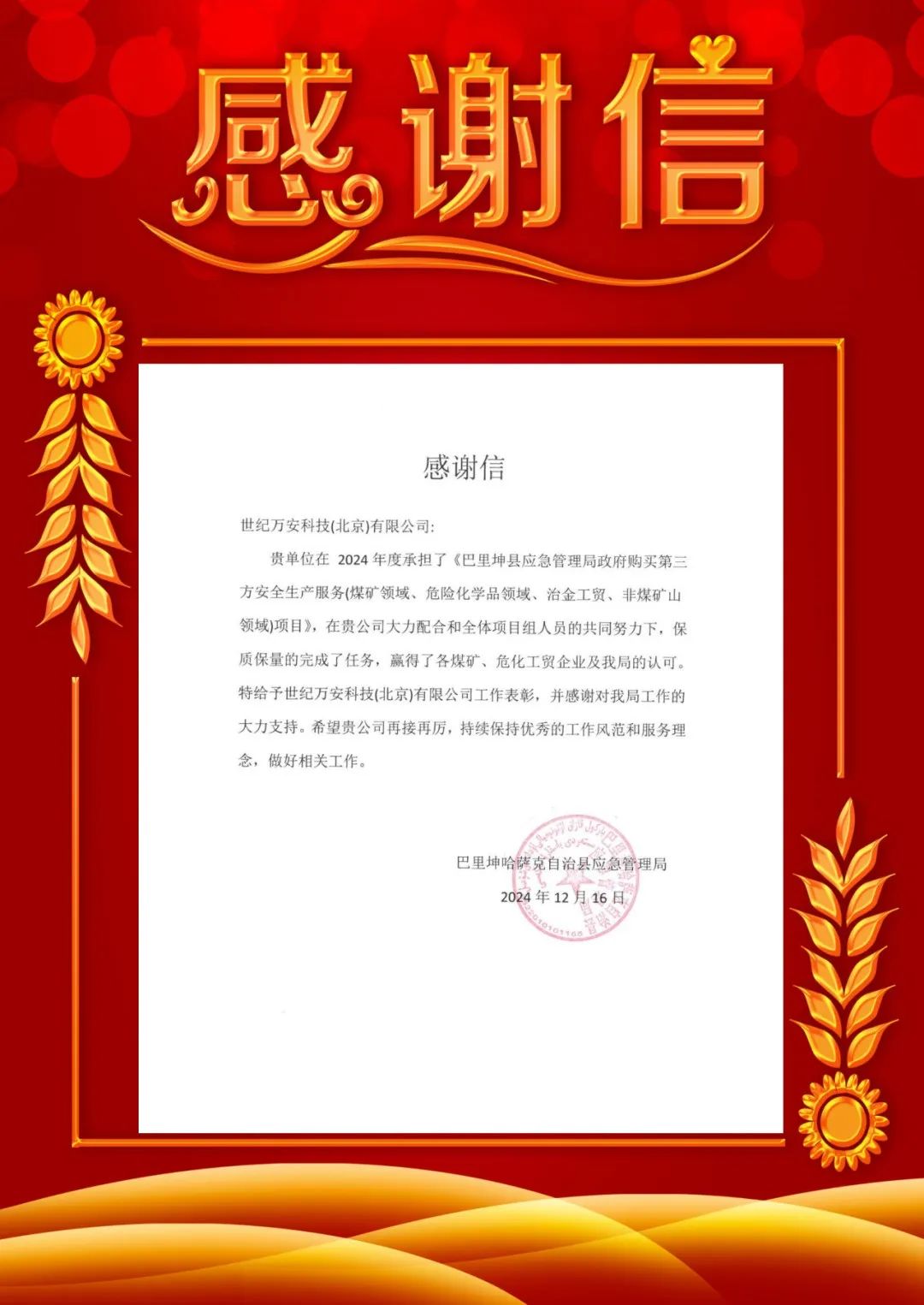 • 世紀萬安公司助力巴里坤縣安全生產提升 應急管理局致函感謝2024-12-20 16:00